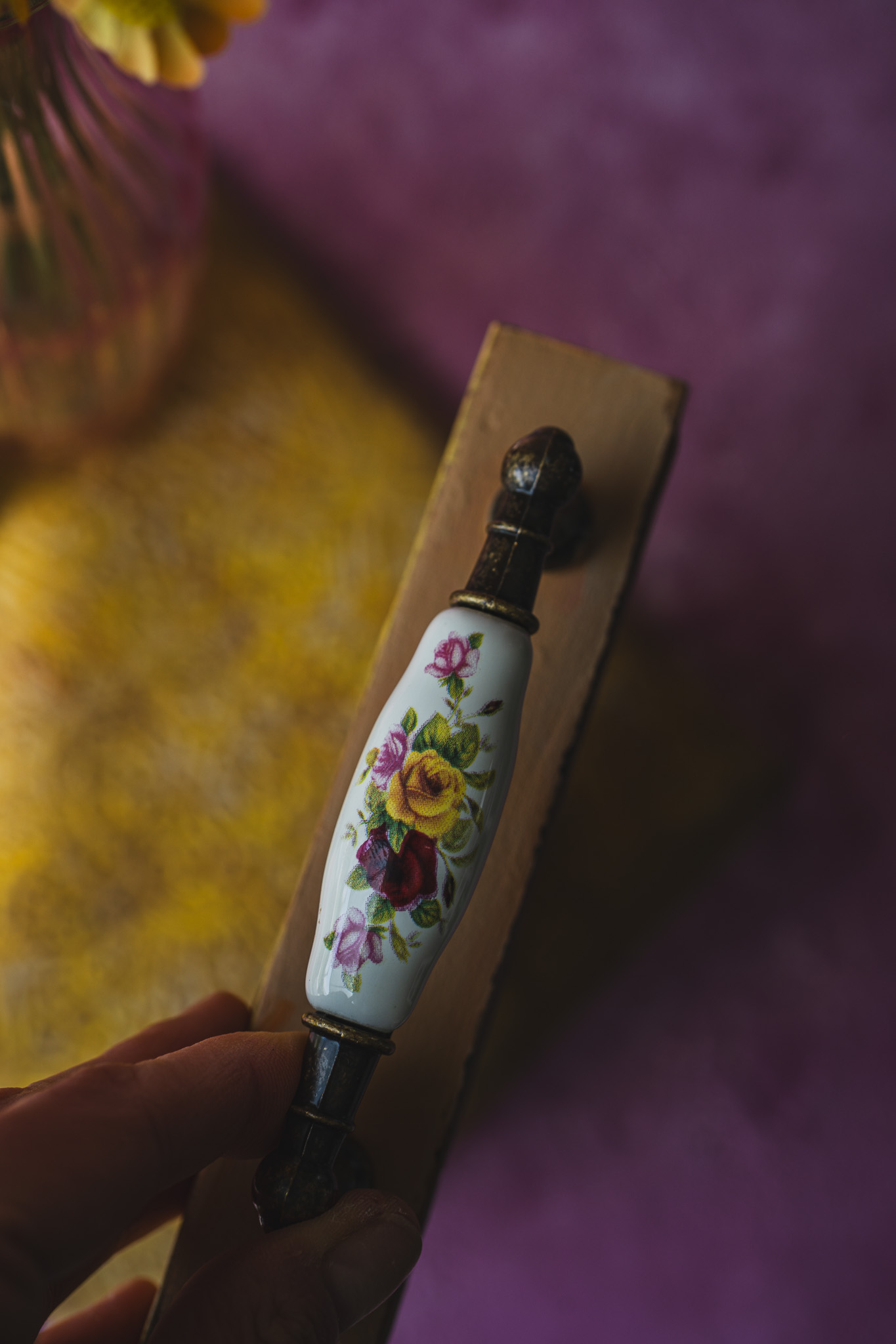 - Deska w stylu vintage z malowanymi kwiatami może być idealnym tłem do prezentacji produktów w stylu rustykalnym, np. świeczników, ozdób świątecznych czy akcesoriów do kuchni.